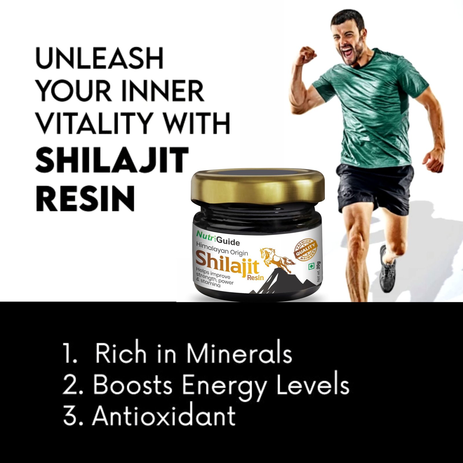 Nutri Guide Shilajit Resin is a premium-quality Ayurvedic supplement derived from the pristine Himalayan mountains. Formed over centuries from plant minerals, this natural resin is rich in fulvic acid, trace minerals, and bioactive compounds that help rejuvenate the body from within.
